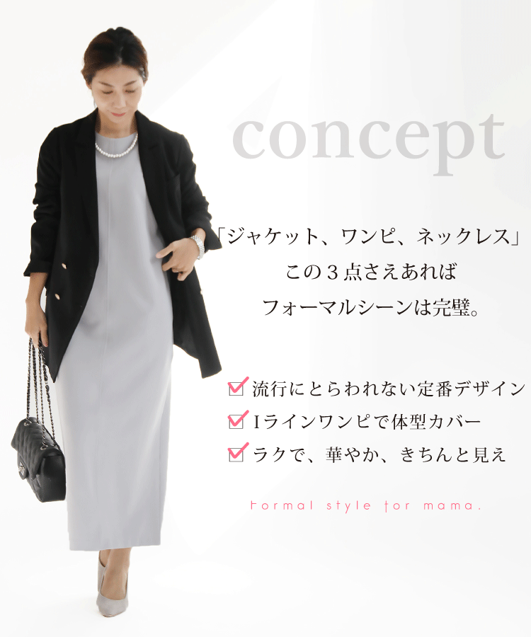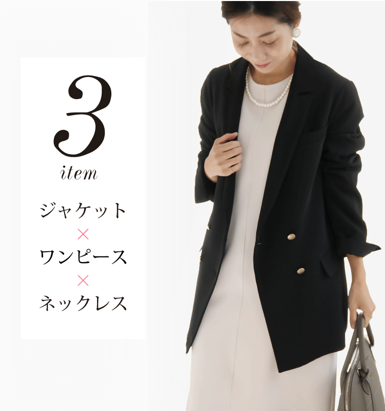 【ジャケット】 ■サイズ/S・M・L Sサイズ:着丈66cm 身幅47cm 肩幅37cm 袖丈59cm 二の腕周り34cm 袖口周り26cm 裾幅48cm ベンツ丈12cm Mサイズ:着丈69cm 身幅49cm 肩幅38cm 袖丈60cm 二の腕周り37cm 袖口周り28cm 裾幅50cm ベンツ丈12cm Lサイズ:着丈72cm 身幅51cm 肩幅39cm 袖丈60cm 二の腕周り40cm 袖口周り30cm 裾幅52cm ベンツ丈12cm ■素材 表地:ポリエステル100% 裏地:ポリエステル100% ■伸縮性 なし ■透け感 なし ■裏地 あり ■原産国 韓国 ジャケットの詳細はこちら> 【ワンピース】 ■サイズ/フリーサイズ 着丈120cm 身幅50cm 肩幅46cm 袖丈47cm 二の腕周り37cm 袖口周り23cm 裾幅51cm スリット丈25cm ■素材 ポリエステル93% ポリウレタン7% ■伸縮性 あり ■透け感 ライトベージュのみややあり ■裏地 なし ■原産国 韓国 ワンピースの詳細はこちら> 【ネックレス】 ■サイズ パールサイズ約6~10mm 長さ約43~48cm アジャスター約5.5cm ■素材 アクリル樹脂 ■重さ 約25g ■原産国 韓国 ■お手入れ 金属アレルギー対応商品ではございません。